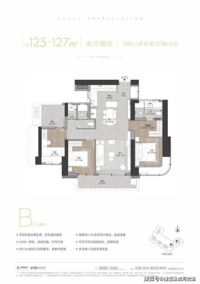 主要户型就是约120平左右的产品,部分户型楼间距更大,景观视野会更好,既有经典传统的3房+1多功能空间格局的方正三房两卫,也有餐客厅同宽、卧室在两侧的双龙抱珠的户型格局。