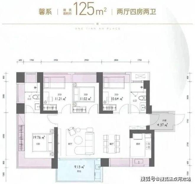 约119㎡ 4房2卫高能户型,单价区间:5-5.29万/㎡