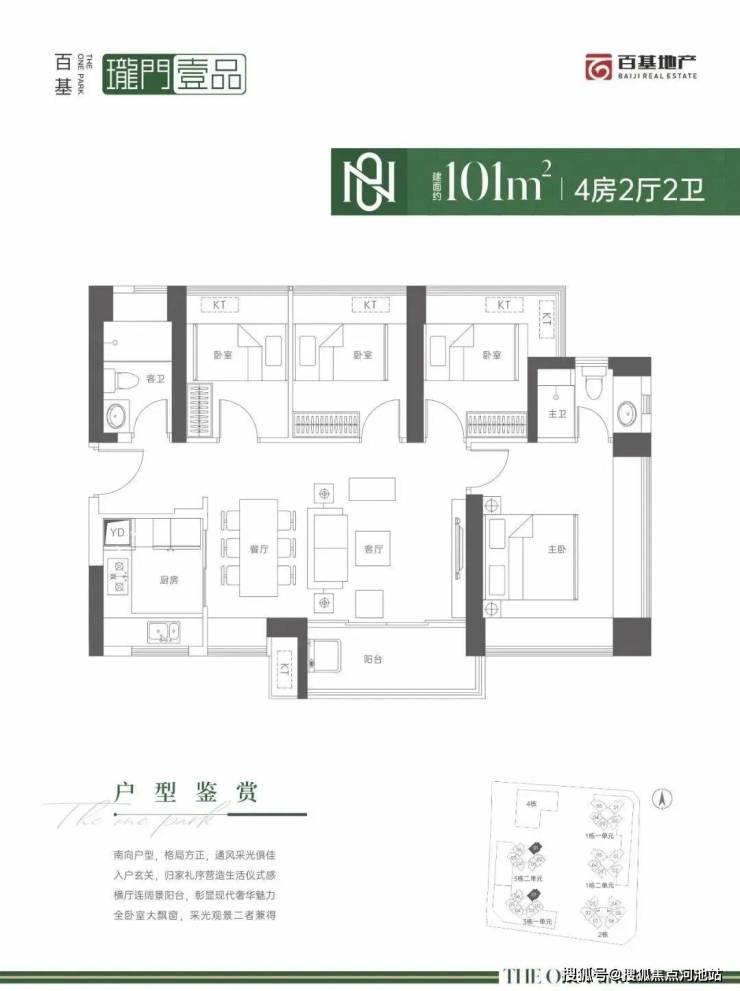 101㎡的4房2厅2卫,设计的是横厅南北通透格局,进门入户玄关,LDKB一体化设计,U型厨房,卫生间干湿分离,阳台主朝东南向。