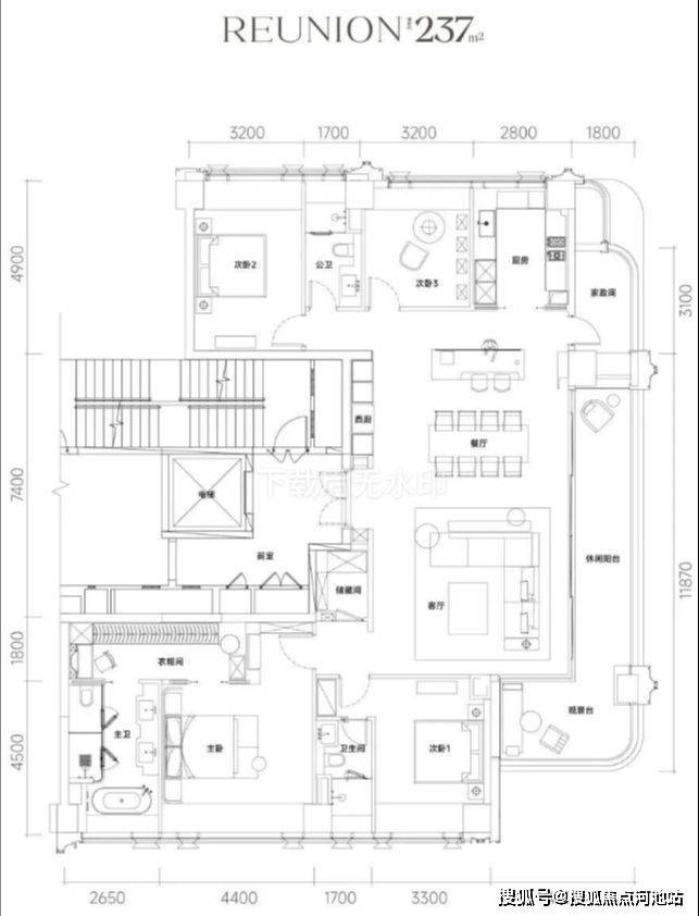 237㎡的4房2厅3卫,设计的是竖厅双龙抱珠格局,一梯一户,专梯入户设计,赠送私用电梯厅,客餐厅8.7米开间,LDKB一体化设计,分别做到了主卧35.3㎡/次卧套间15.93㎡/次卧16.51㎡/次卧12.34㎡(包含墙体飘窗),客厅连接餐厅出8.7米长的超大观景阳台约15.66平,另外东南向还有个观景阳台约10.08平,西厨位置有6.66平生活阳台,U型厨房另设西厨岛台,卫生间干湿分离,得房率约100%(包含赠送),东北朝向。