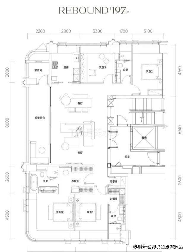 197㎡的4房2厅3卫,设计的是竖厅双龙抱珠格局,一梯一户,专梯入户设计,赠送私用电梯厅,客餐厅7.95米开间,LDKB一体化设计,四开间朝南,分别做到了主卧28.2㎡/次卧套间18.3㎡/次卧14.87㎡/次卧11.71㎡(包含墙体飘窗),客厅连接餐厅出10米长的超大观景阳台约22平,U型厨房,卫生间干湿分离,得房率约100%(包含赠送),西南朝向。