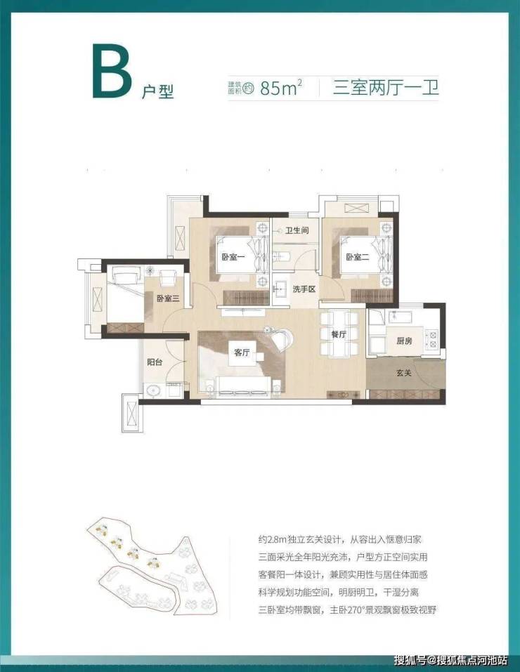 85㎡三房两厅大三房,2.8m超长玄关,270度景观飘窗,明厨明卫