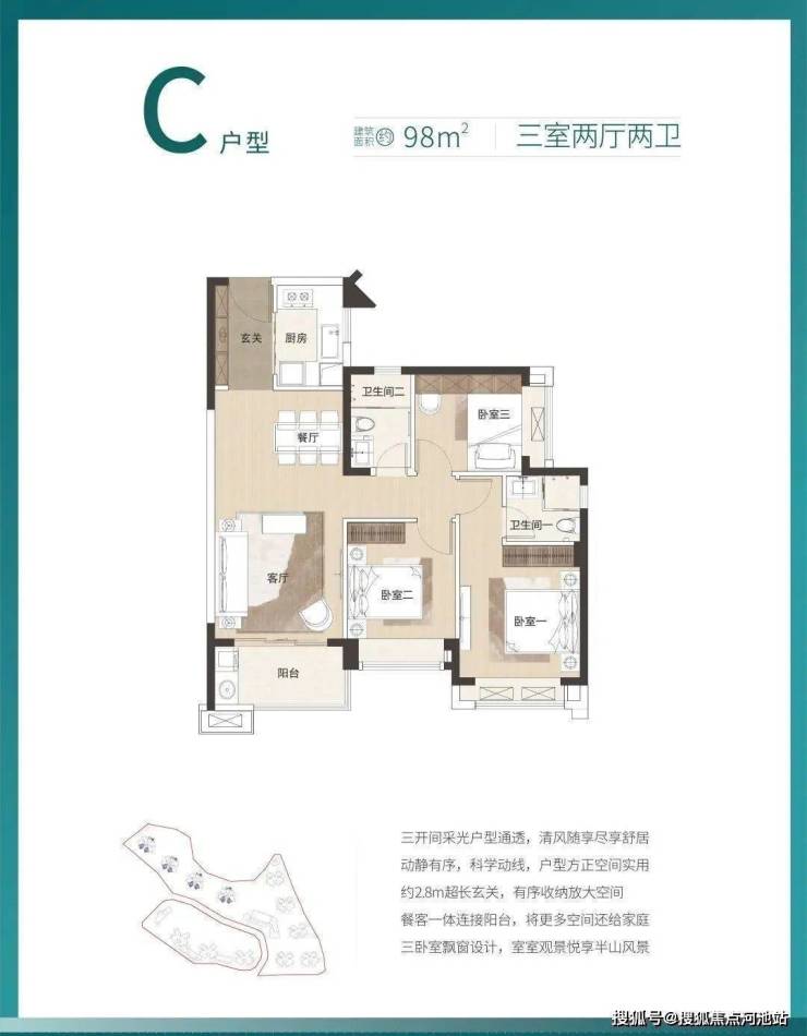 100㎡通透性三房两厅2卫大三房,2.5m超长玄关,南北通透,景观大阳台