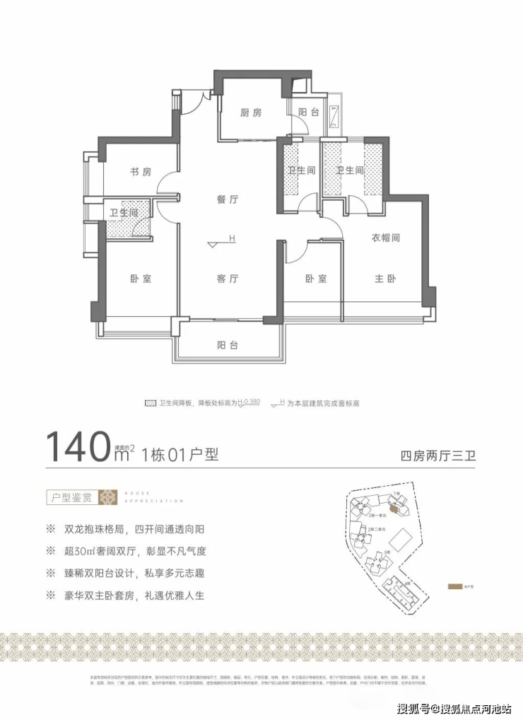 由4栋住宅(48层)和1栋公寓(46层),住宅总户数1011户,其中回迁609户,可售住宅为402套,本次计划推157套房源。