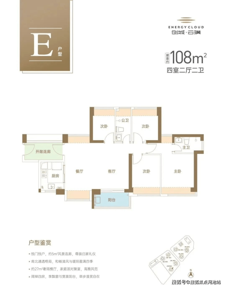 -108㎡4房2厅2卫:设计的是横厅南北通透格局,客餐6.2米开间,U型厨房,卫生间干湿分离,有额外赠送一大块入户花园,阳台主朝东南向,仅有2栋4单元03户型才有这个面积段户型。