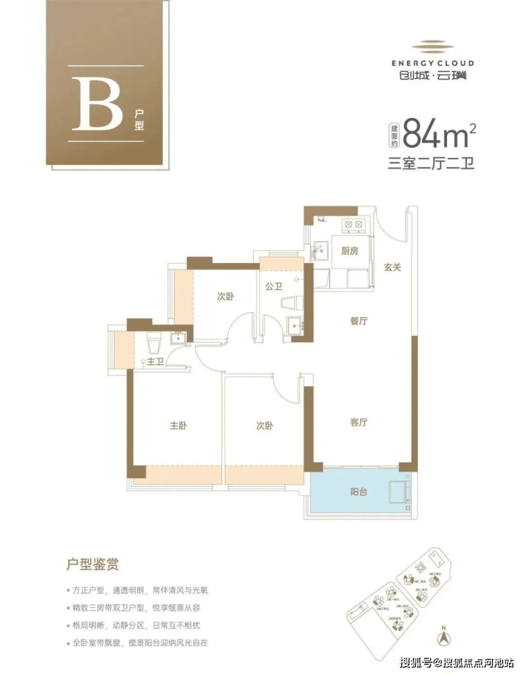 -84㎡3房2厅2卫:设计的是竖厅格局,LDKB一体化设计,客厅3.4米开间,U型厨房,卫生间干湿分离,阳台有正东、西北、东北、东南、西南朝向。
