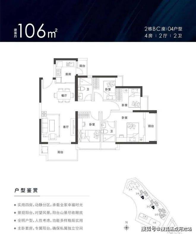 106㎡的4房2厅2卫,设计的竖厅格局,客厅主卧双阳台设计,厨房也带小阳台,三开间朝南,客厅朝西南向,高层可看山景。