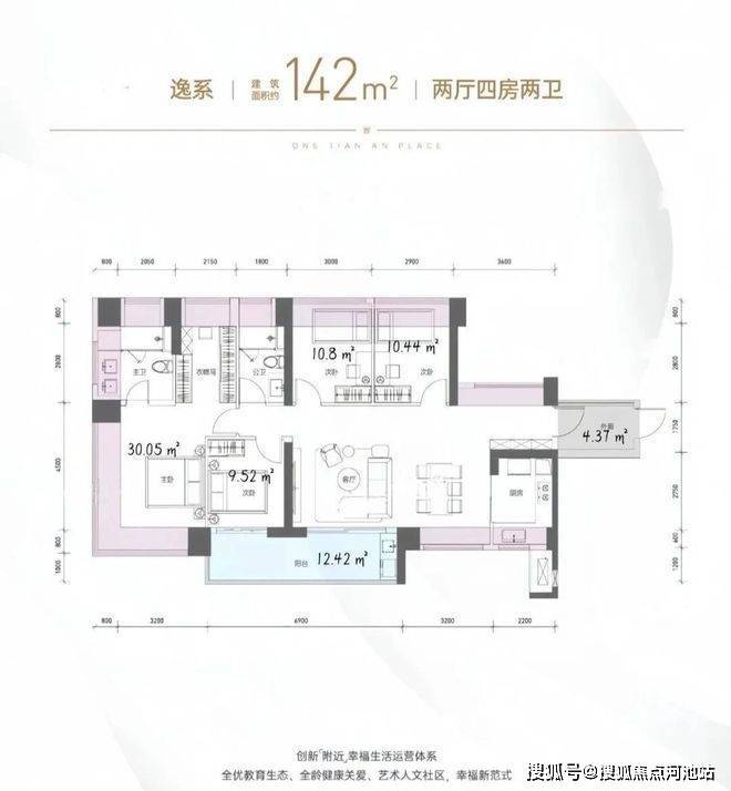 142㎡的4房2厅2卫,2栋1/2/3单元02户型,设计的是横厅南北通透格局,独门独户,赠送约4.37平的入户空间,客餐厅7.3米开间,LDKB一体化设计,五开间朝南,主卧带大衣帽间,分别做到了主卧30.05㎡/次卧10.8㎡/次卧10.44㎡/次卧9.52㎡(包含墙体飘窗),客厅连接次卧出6.9米长的大阳台约12.42平,U型厨房,卫生间干湿分离,得房率约104.2%(包含赠送),西南或东南朝向。飘窗赠送面积23.8㎡+阳台赠送6.21㎡+外廊赠送4.37㎡=实际赠送34.38㎡。