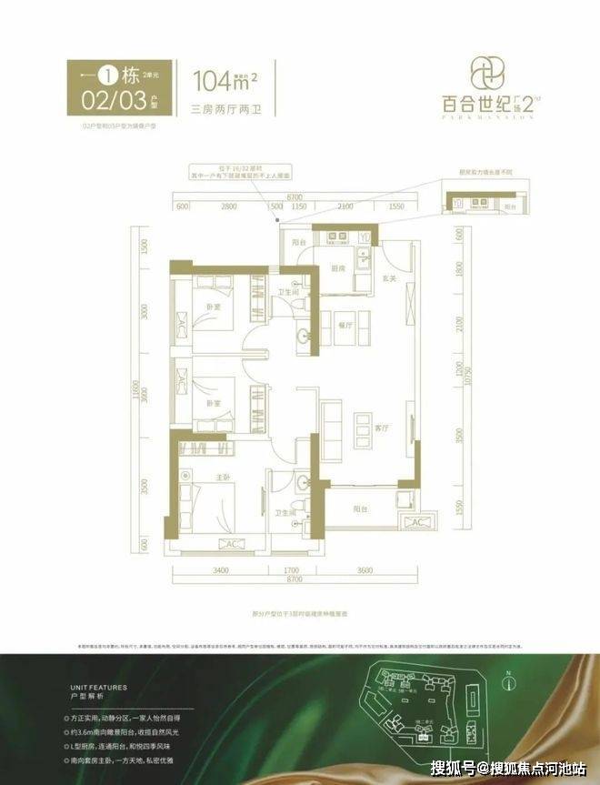 104㎡的3房2厅2卫,1栋02/03户型,设计的是竖厅格局,客厅3.6米开间,LDKB一体化设计,三开间朝南,动静分区,得房率约76%(不含赠送),正南朝向。套内面积79.04㎡+赠送10.31㎡=实得89.35㎡,加上赠送得房率约85.91%。