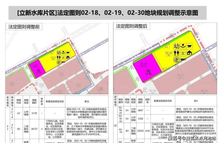 经规划主管部门审议并原则通过,拟对[立新水库片区]法定图则02-18、02-19、02-30地块规划进行调整。调整后: