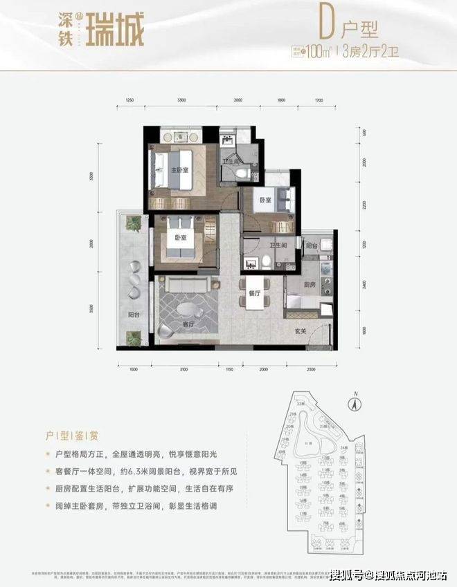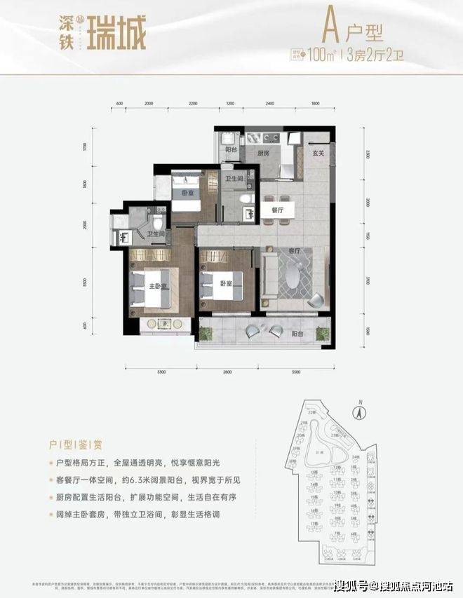 100㎡的3房2厅2卫,A户型,设计的是经典竖厅格局,进门入户玄关,客厅3.5米开间,LDKB一体化设计,动静分区,3个卧室分别做到了主卧12㎡/次卧7.57㎡/次卧6.01㎡(实测面积,去掉墙体),客厅连接次卧出6.3米长的阳台,L型厨房还带1个生活阳台,卫生间干湿分离,得房率约:75.76%(不含赠送),西南或东南朝向。