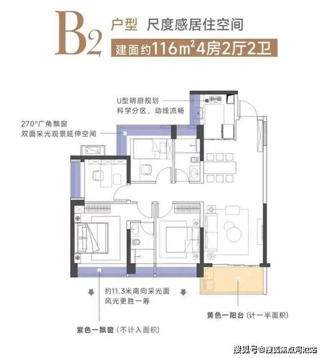 云山海户型设计的非常不错,按照常规备案的公式不计赠送,使用面积能到约75%以上,如果计算上飘窗,阳台等赠送的面积,实际使用率会在85%以上。